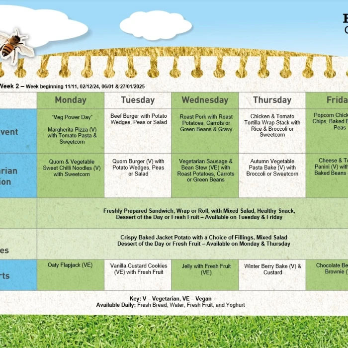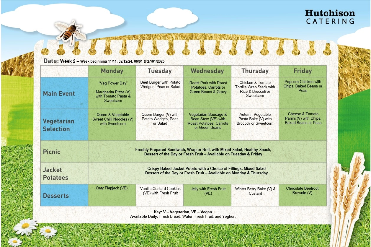 We have a Meat Free Day in each menu cycle and work with catering providers Hutchinson to create healthy and appealing menu choices. Please have a look at the menu sheet below so that you can discuss food choices with your child. The menus may change slightly at short notice due to circumstances beyond our control, however this would only be on a rare occasion.
